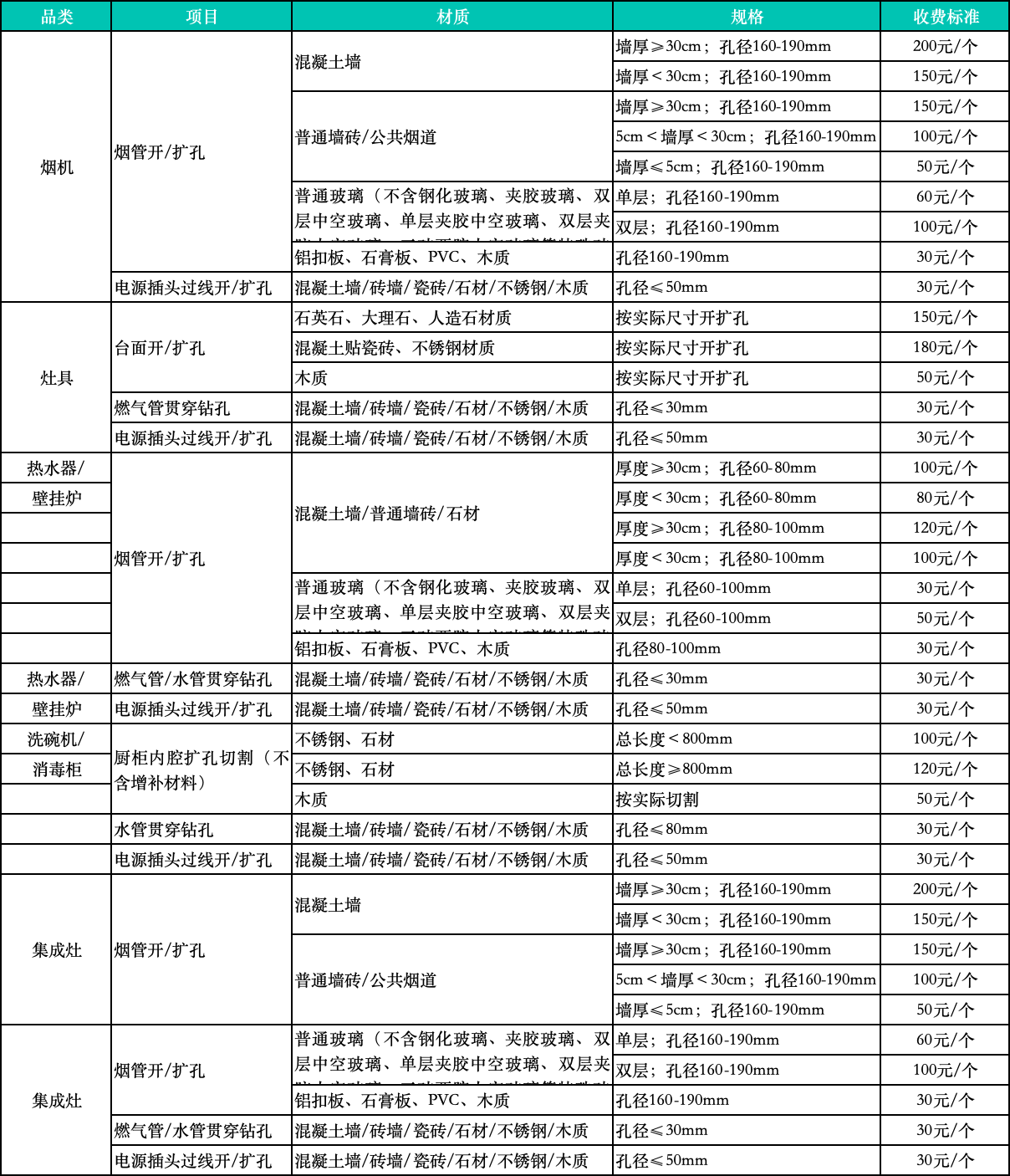 五、廚衛電器安裝開孔擴孔服務收費標準