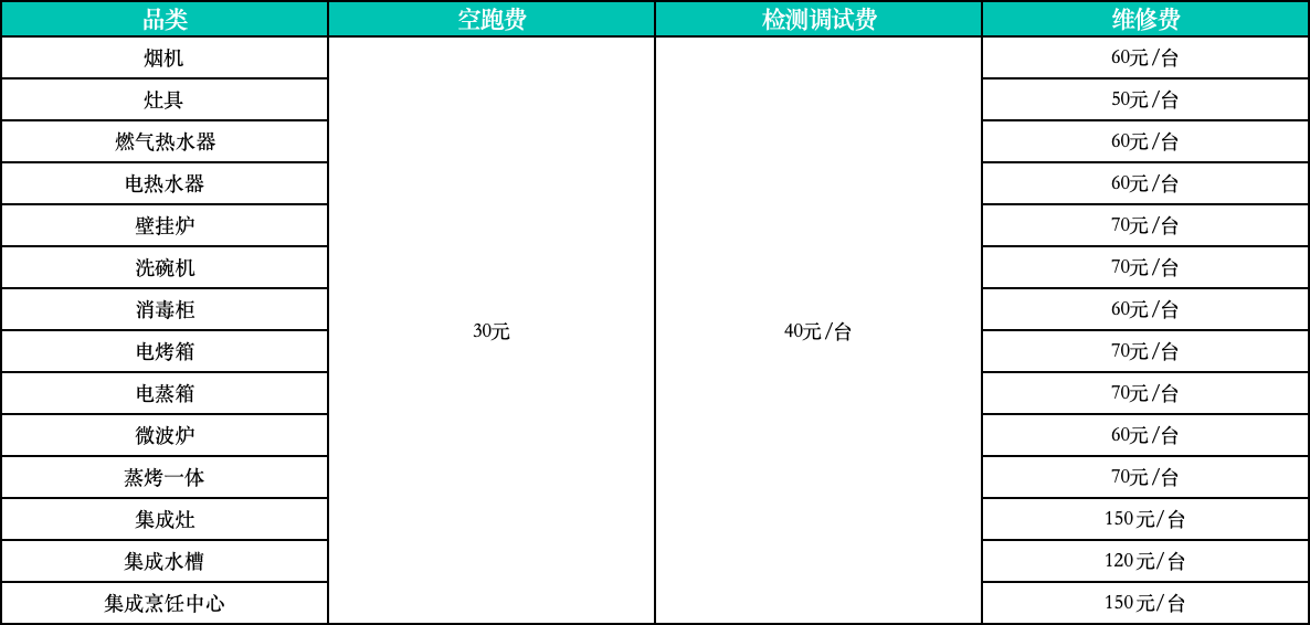 b、維修服務費按照《華帝股份各類產品保外上門維修服務收費標準》進行收取,若上門對產品未進行維修或調試,則不收取維修服務費或檢測調試費,只收取上門空跑費;